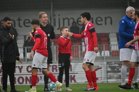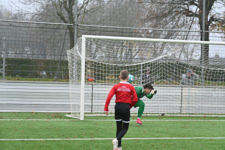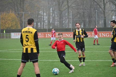 De hele zaterdag in touw. In miezerig weer. Dat deert Noah totaal niet. ’s Ochtends bij Festilent met 5-4 gewonnen met de JO 9-3. Een helft gekeept, de andere helft als linkerverdediger beslissend met een steekpass en een assist. Daarna, nog maar acht, lekker warming-uppen tussen de grote mannen van JVC 1. Genieten. En dan die dribbel en dat genadeloze schot langs de Tielse doelman. Die is blij dat hij het overleeft.